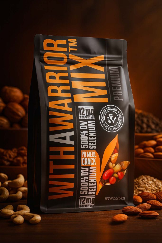 Now it’s WithAWarrior Mix™ — matte black pouch, orange calyx window, clinically-dosed adaptogens that taste like childhood.